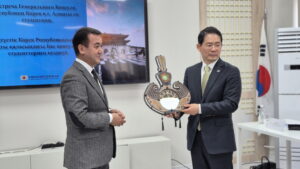 환영식 이후에는 동방학부장과 하태욱 총영사 간의 짧은 환담도 이어졌다. 이 자리에서 미르자한 에감베르디예프 동방학부장은 “오늘 총영사님과 만나 많은 이야기를 나눌 수 있어 매우 기쁘다”며, “앞으로 양국의 교육 및 문화 교류가 더욱 활발히 이루어지길 바란다”고 말했다. 특히 그는 한국어 교육에 대한 학생들의 높은 열의를 강조하며 “이러한 관심이 실제 교류와 유학, 공동 연구로 이어지길 기대한다”고 밝혔다. 이에 하태욱 총영사는 “카자흐스탄 대학생들의 한국에 대한 관심과 높은 수준의 한국어 실력에 깊은 인상을 받았다”며, “총영사관도 앞으로 학술·문화 교류 확대를 적극 지원하겠다”고 화답했다. 두 사람은 앞으로 문화·교육 분야에서 더 깊은 협력 관계를 이어가길 희망하며 의견을 나눴으며, 동방학부장은 총영사에게 감사의 뜻을 담아 기념 선물을 전달했다.