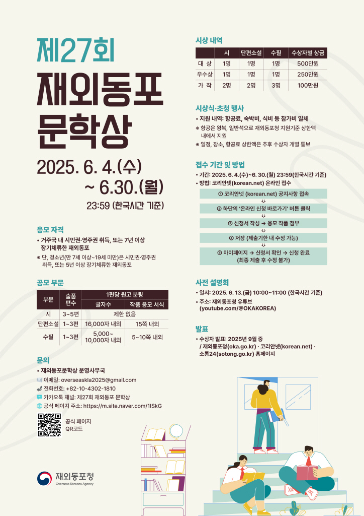 재외동포청은 전 세계 180여 개국에 거주하는 재외동포를 대상으로 ‘제27회 재외동포 문학상’ 공모전을 개최한다. 재외동포청에 따르면, 이번 공모전은 한민족 정체성을 강화하고 동포와 내국인 간 상호 이해를 높이는 취지로 1999년부터 매년 시행되고 있다.