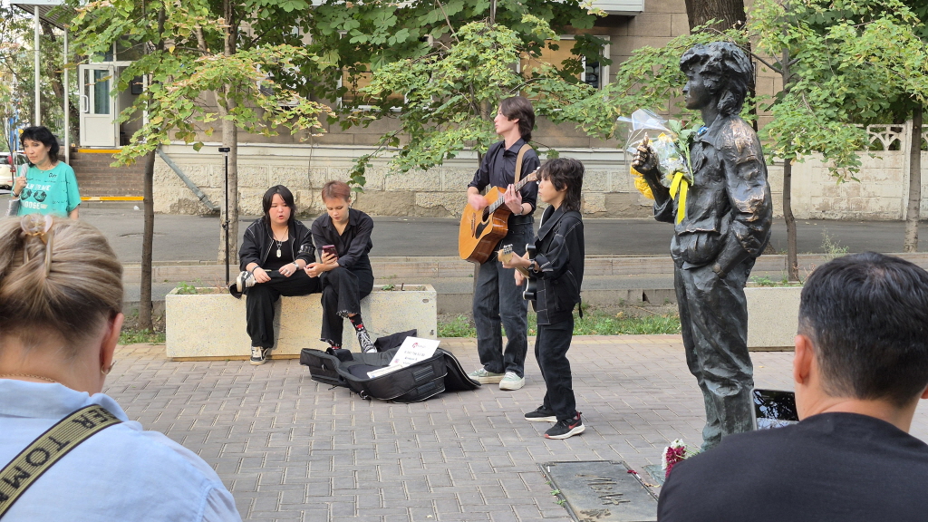 그날, 알마티의 또 다른 거리에서는 조용하지만 의미 깊은 추모의 순간이 있었다. 바로 러시아 록 음악의 전설이자 고려인 3세로 알려진 빅토르 초이의 35주기를 기리는 추모 행사와 작은 공연이 카반바이바트라와 툴렌지예바 교차로에 위치한 그의 동상 앞에서 열렸다. 이곳은 유명 커피숍과 문화 공간이 밀집해 있어 젊은이들이 자주 찾는 장소로, 빅토르 초이의 음악을 기억하는 이들이 자연스럽게 모여드는 공간이기도 하다.